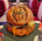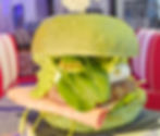 Burger di manzo con mortadella, in bun XL verde alla clorofilla, spinacino, burrata e pesto di pistacchio.