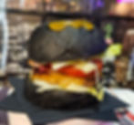 Burger di manzo in bun nero al carbone, con cipolla caramellata, Bacon, cheddar, lattuga e pomodoro.